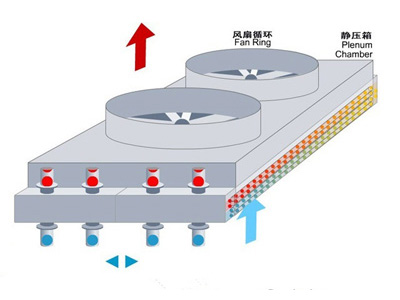 空氣冷卻器簡稱空冷器,以空氣作為冷卻劑,可用作冷卻器,也可用作冷凝器。空冷器主要由管束、支架和風機組成。空氣冷卻器熱流體在管內流動,空氣在管束外吹過。由于換熱所需的通風量很大,而風壓不高,故多采用軸流式通風機。