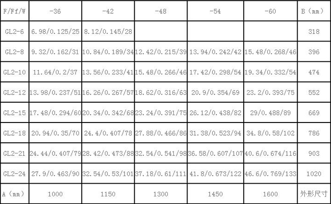 GLⅡ空氣熱交換器散熱面積F(m2)、通風凈截面積Ff(m2)、參考重量W(Kg)、安裝尺寸等一覽表